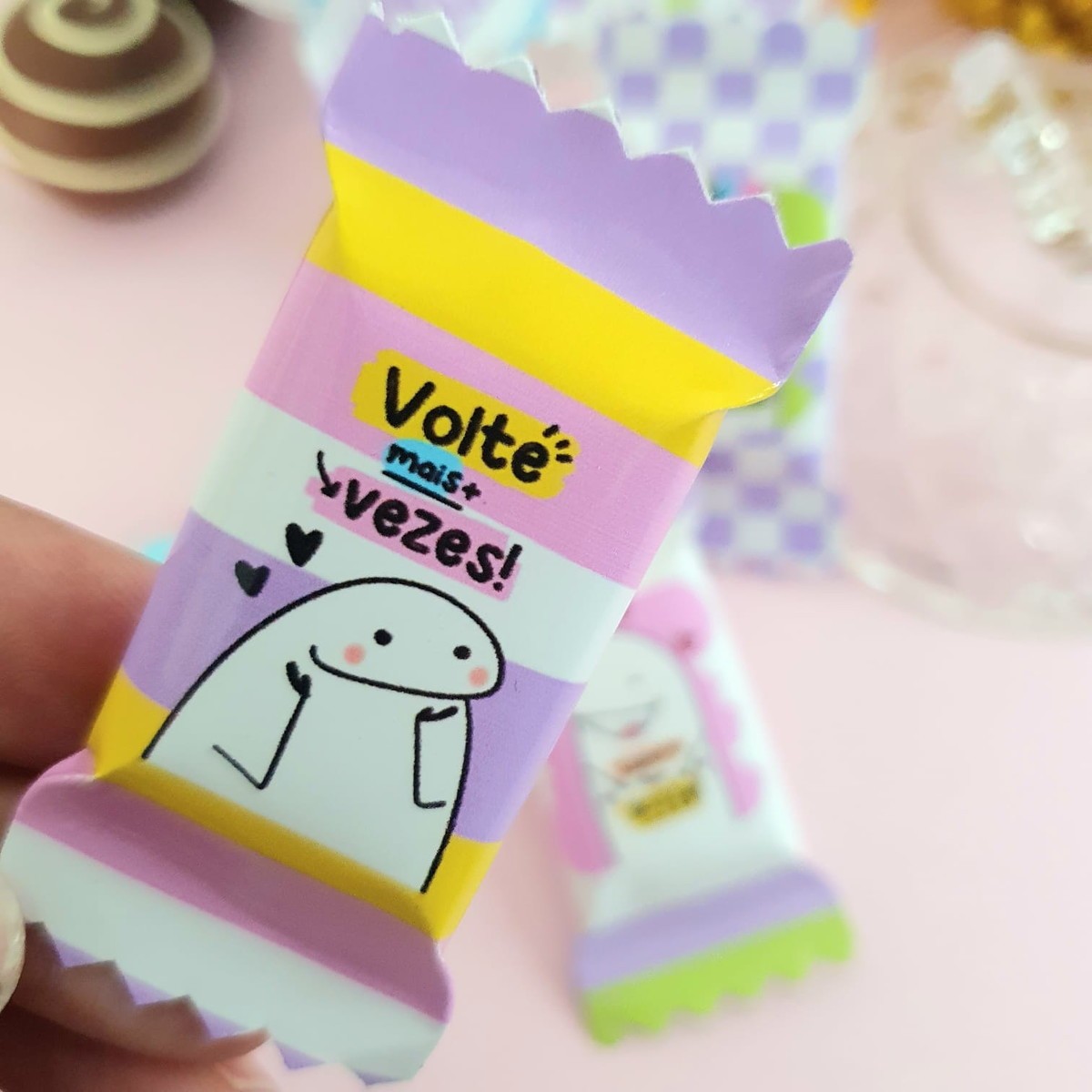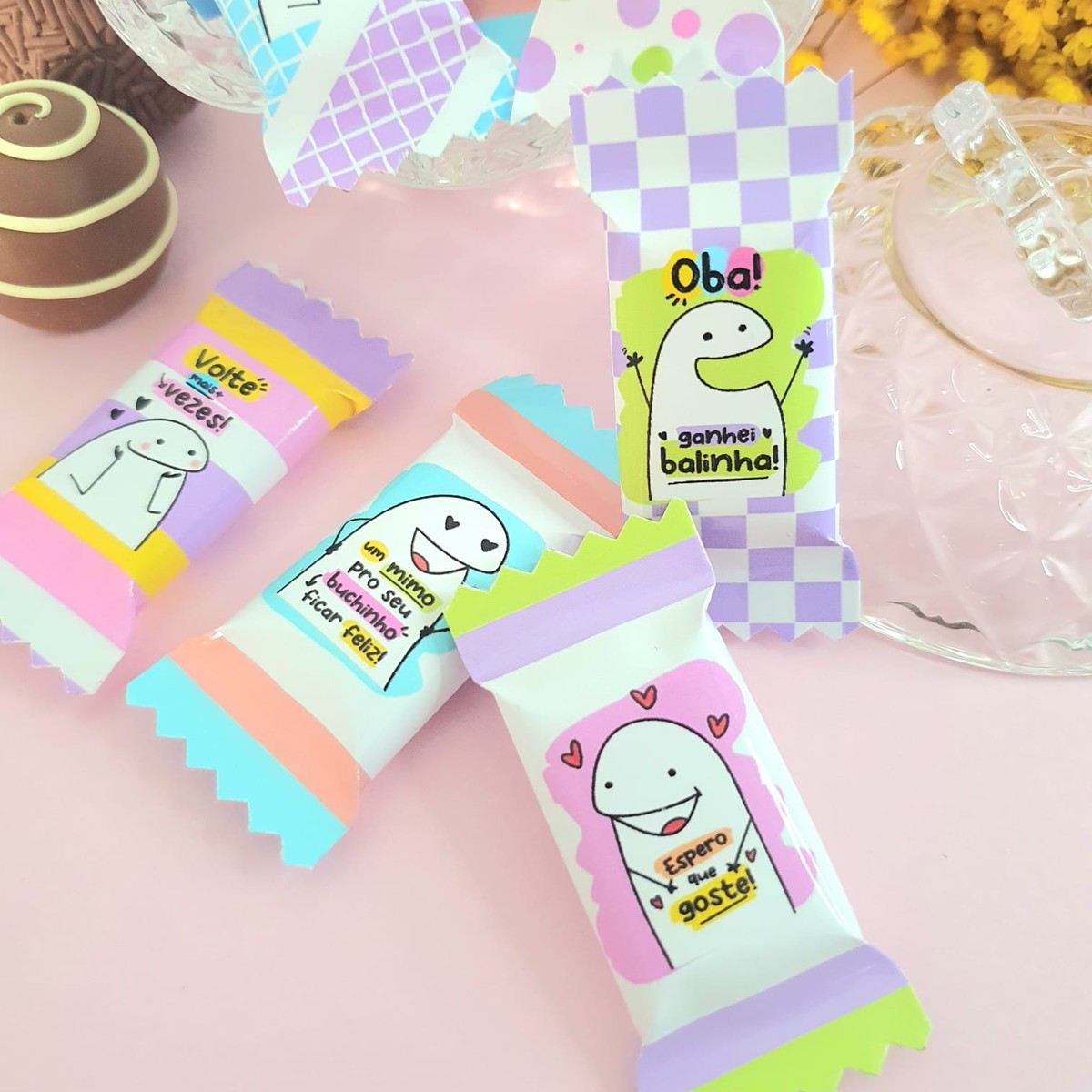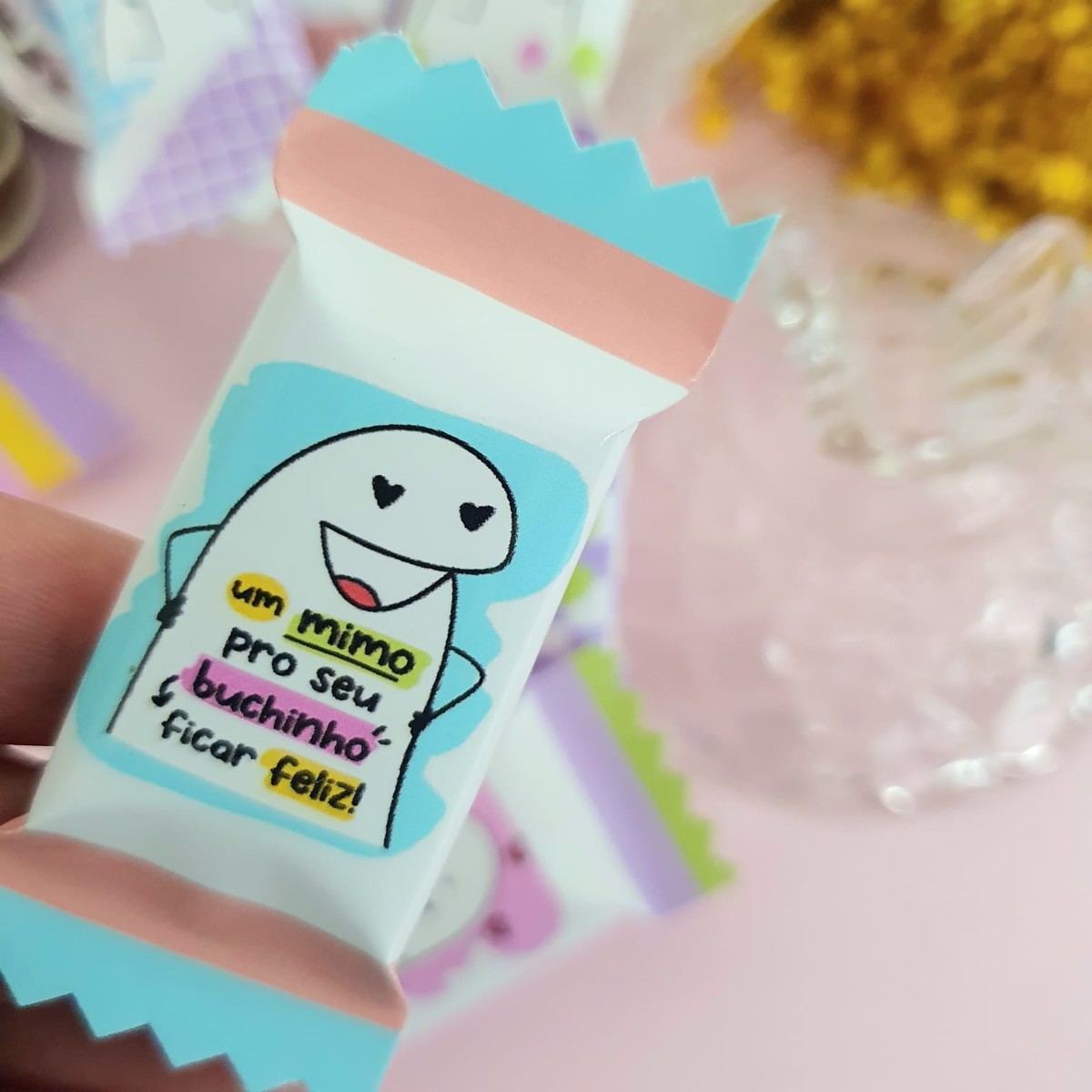 As balas vão embaladas em rótulo adesivo personalizado de acordo com o tema escolhido.